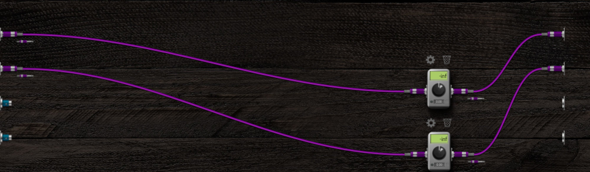 I used the most simple pedalboard I can think of. Two signal chains with input connected to the output with the TinyGain Mono inline in each.