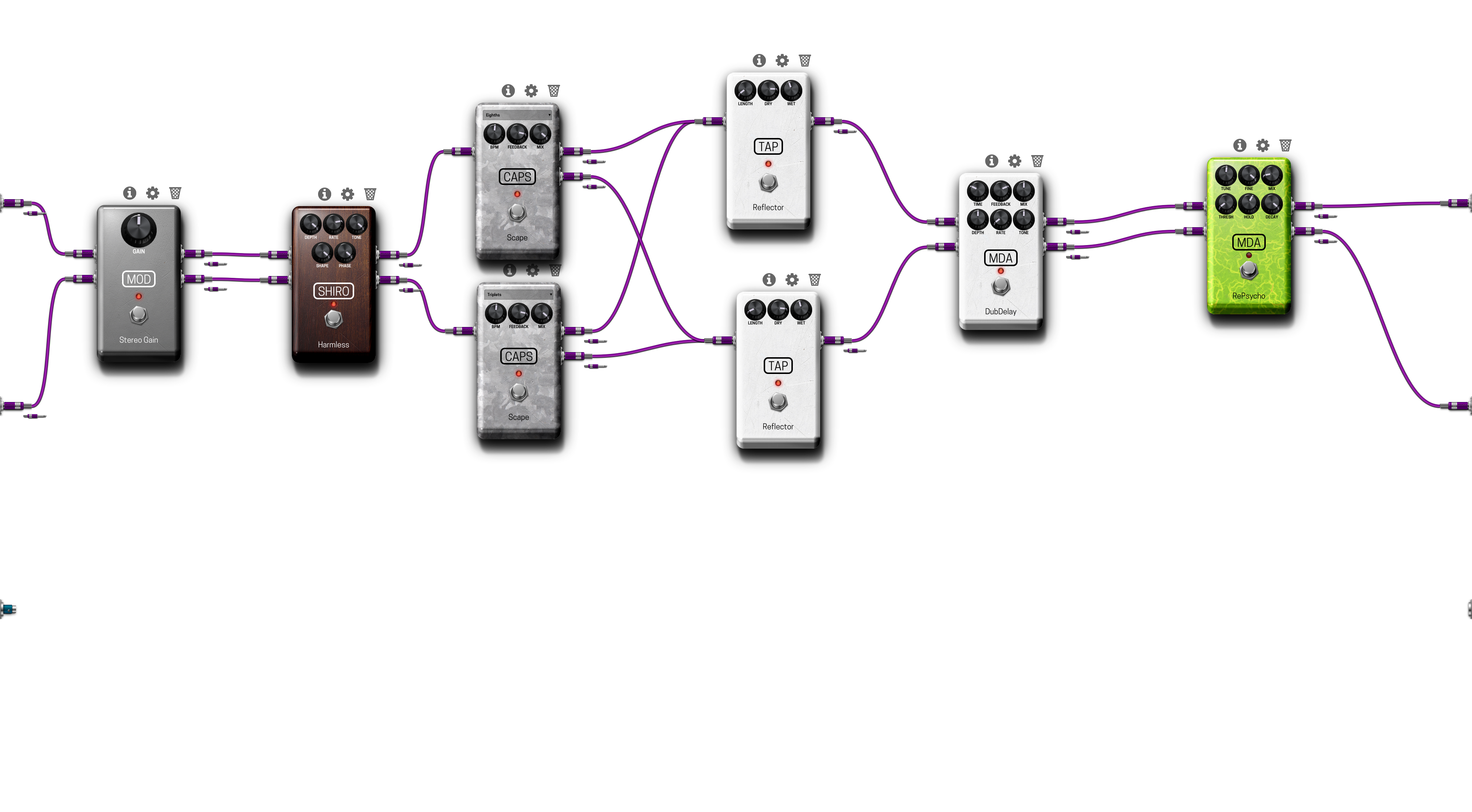 Finally, a Slicer or Chopper or whatever you call it! I've been looking around for a slicer effect for a long time and finally decided to handcraft my own artisinal bespoke pedal! Only can a platform like the Mod Duo offer you this kind of creativity. The only addition needed is to get a tap tempo added. I added in the RePsycho as a last pedal but it's turned off by default. I think it's a little too much, but it could be cool to turn on as the signal decays for additional effect. Btw, the decay on this is ridiculous. Enjoy!
