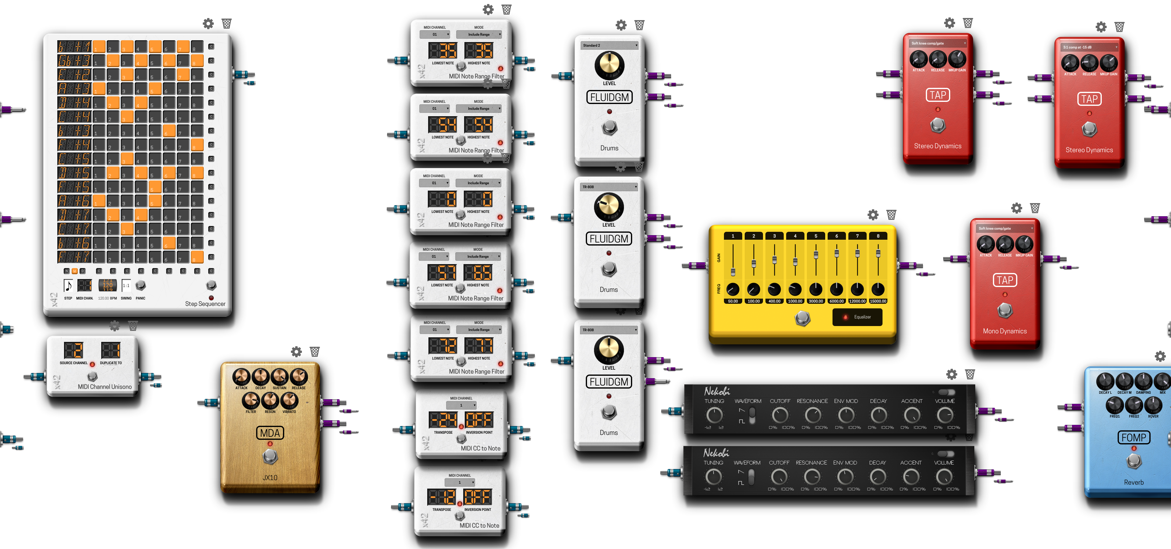 Thanks @acunha! The step sequencer plugins are really easy to use, they’re comparable to hardware sequencers like the Korg SQ-1(0). It’s basically a matter of setting the right notes, note length and tempo for your sequences, connect them to plugins that accept MIDI input and generate noise and then select the desired steps to generate your beats, bass-lines and melodies