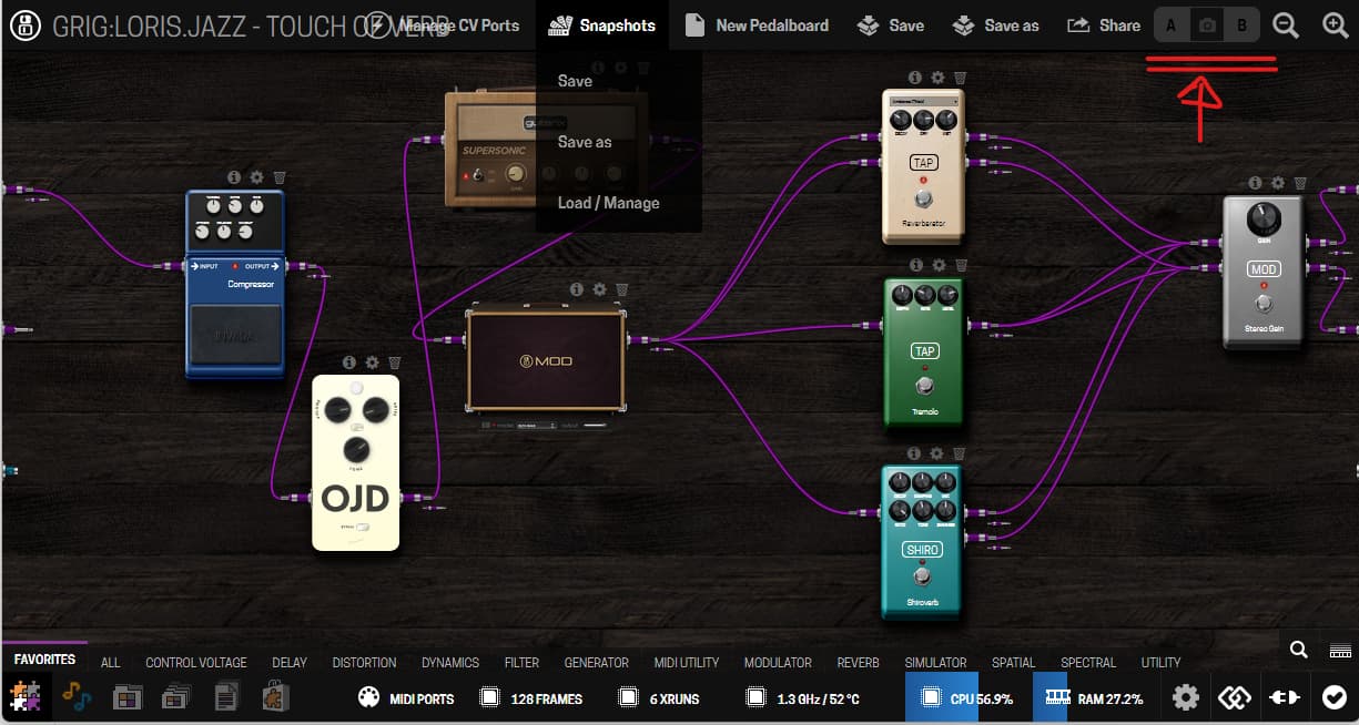 In this version, when you load a pedalboard, you’ll notice a new A/B Compare section in the upper-right corner of the interface.