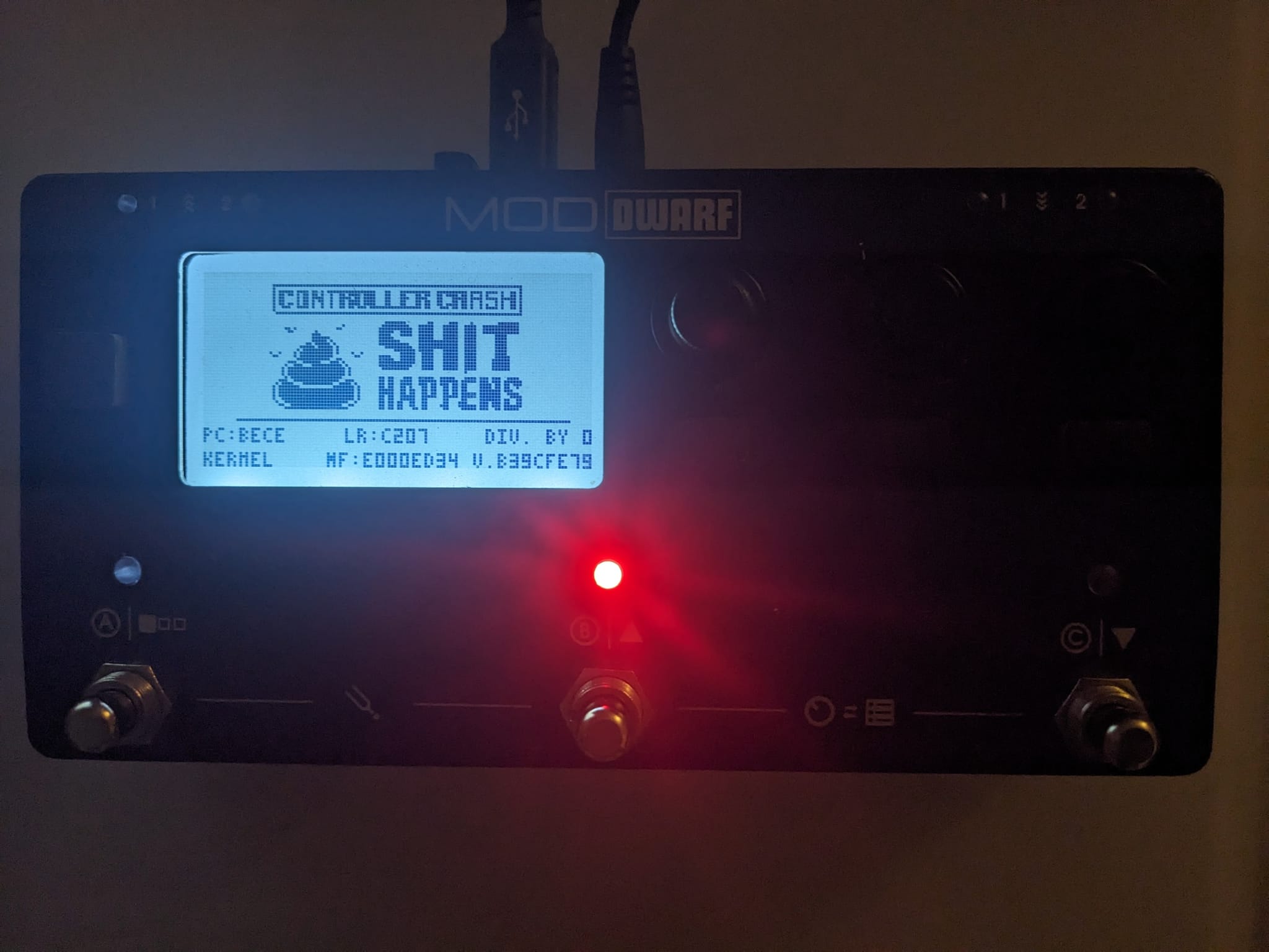 Both the screen and the footswitch LED color contain important details that can help with debugging.